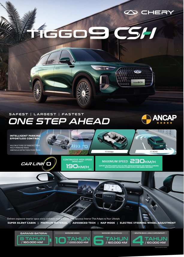 Chery TIGGO 9 CSH AWD hadir bukan sekadar SUV mewah, tetapi sebagai kendaraan futuristik yang memadukan kemewahan, keamanan, efisiensi, dan performa tinggi dalam satu paket. Kendaraan ini telah lolos uji keselamatan dari berbagai lembaga internasional, seperti Euro NCAP, ANCAP, ASEAN NCAP, Latin NCAP, dan C-NCAP, menjadikannya pilihan ideal untuk keluarga modern yang mengutamakan kenyamanan dan perlindungan.